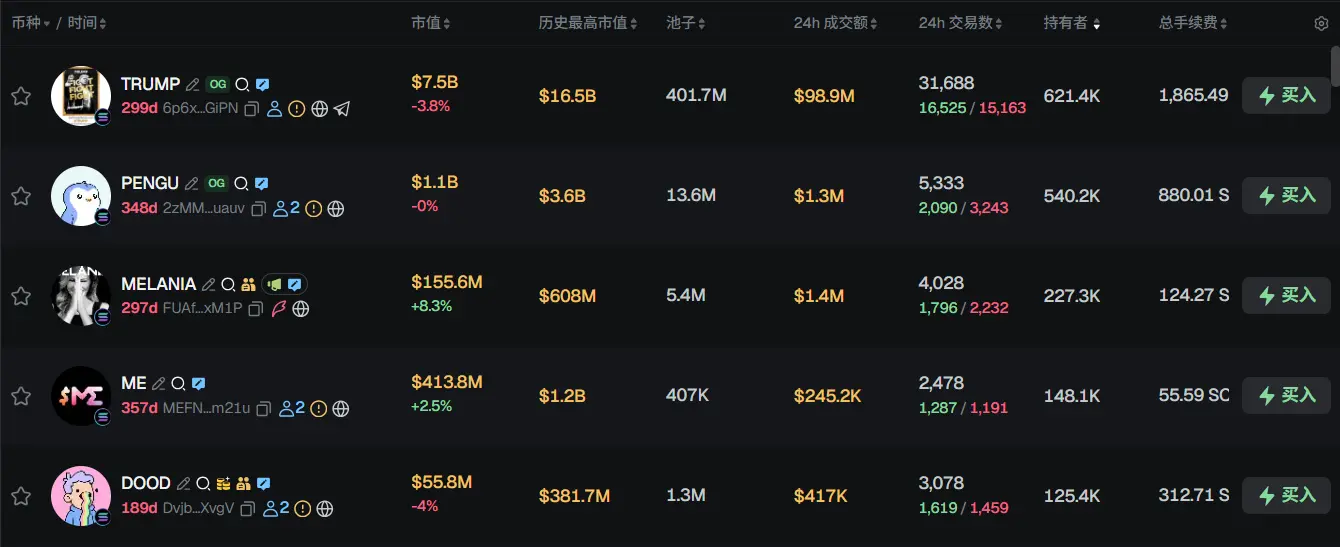 过去 24h Solana 热门代币前五依次为:TRUMP、PENGU、MELANA、ME、DOOD