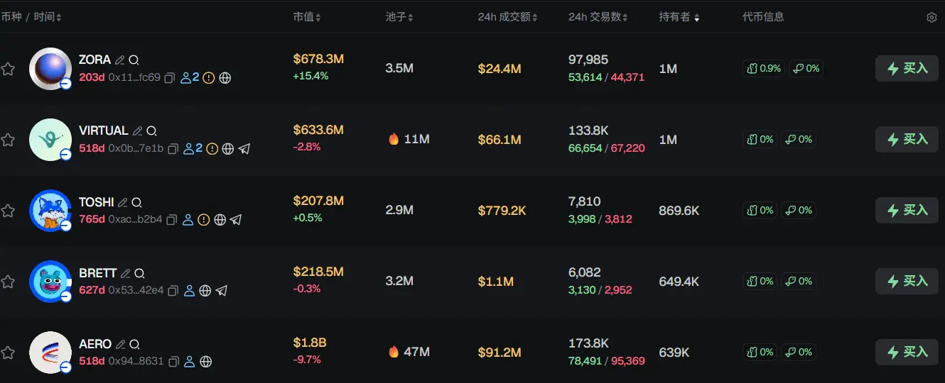 过去 24h Base 热门代币前五依次为:ZORA、VIRTUAL、TOSHI、BRETT、AERO