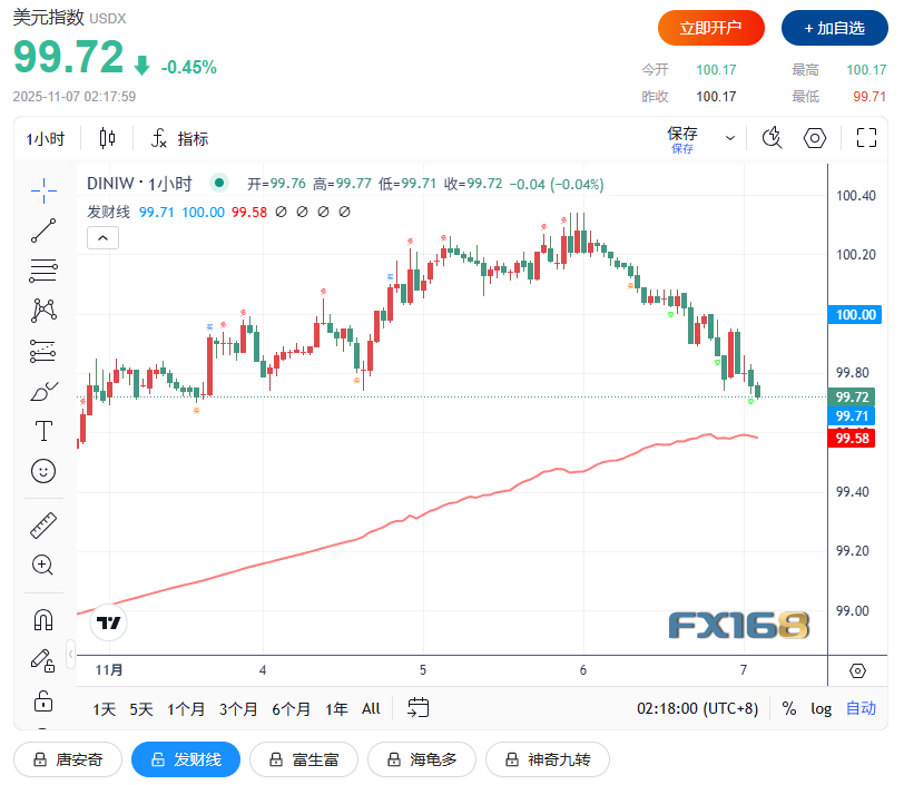 美市盘中,美元指数持续走低并刷新日低至99.71附近,较前一日触及的四个月高点回落。欧元/美元触及1.1546高点,美元/日元跌至152.83低点。