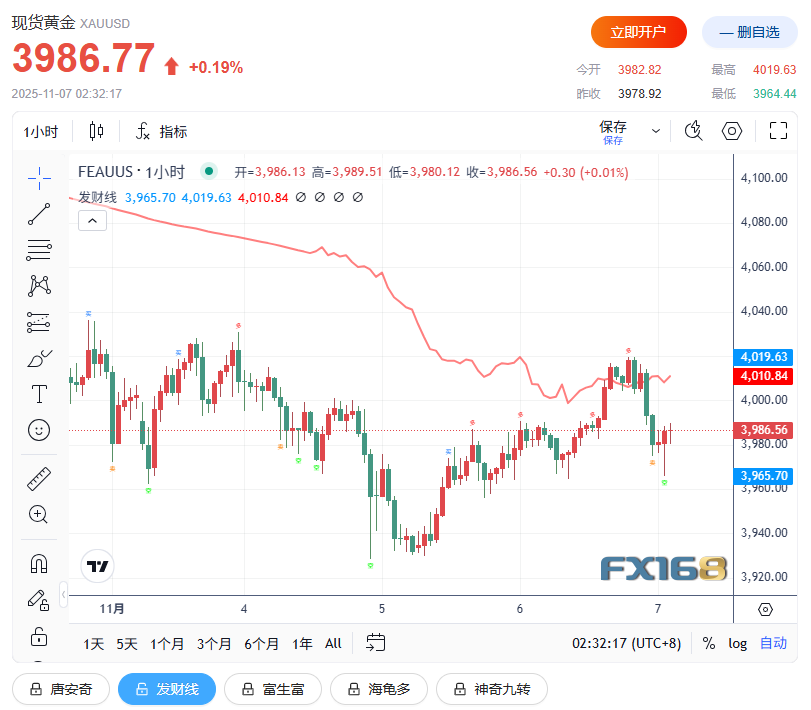 日内稍早,现货黄金一度触及3964.44美元/盎司低点,现回升至3987美元一线。美元小幅回落、美债收益率下滑1.3%,叠加美国政府停摆与关税不确定性,推动金价强劲上行。