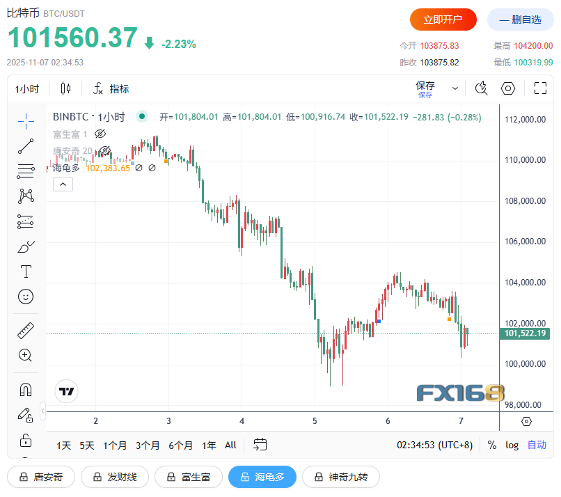 数字资产市场波动加剧。比特币本周一度跌破 10万美元,创下五个月低点 98,900美元,现反弹至 101,000美元上方交投。