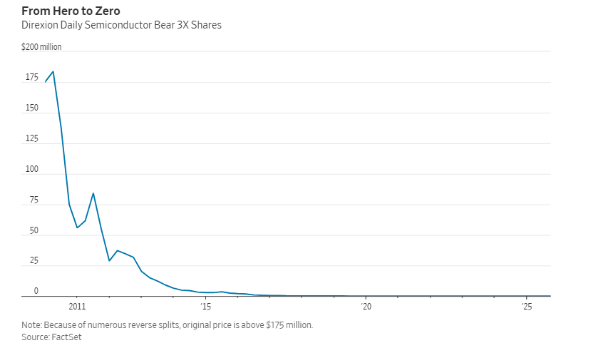 以一篮子股票为基础的类似杠杆ETF,在美国已经存在一段时间。例如,一只三倍做空半导体指数的ETF在那天同样大跌,自成立以来累计跌幅高达99.99999%。尽管还没归零,但也只剩一点点,并且花了多年才到这一步。