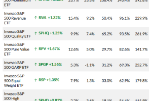 接下来的九只景顺ETF,则通过追踪标准普尔道琼斯指数公司维护的专项指数,采用不同的加权方法或挑选标普500中的子集进行投资。这些基金按五年回报进行排序。