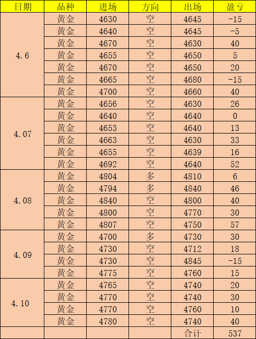 4.06周一上午布局黄金4630空止损离场,内部二次4670接回空单下跌4625拿下,午间反弹4655空,4670补仓空有惊无险下跌4650全收,下午反弹4665空下跌4645拿下,二次4665空在4680扫损,随后4700继续开空下跌4660止盈离场。