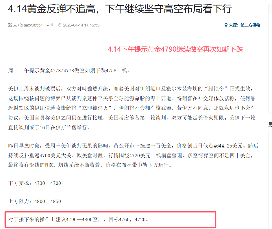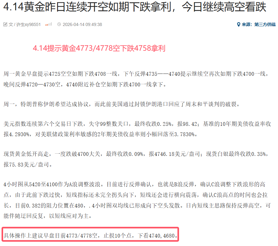 4.14周二上午提示黄金4773/4778做空如期下跌4758一线。下午反弹4790继续提示开空又是如期下跌4752。晚间提示4780再次做空又是如期下跌4762拿利。