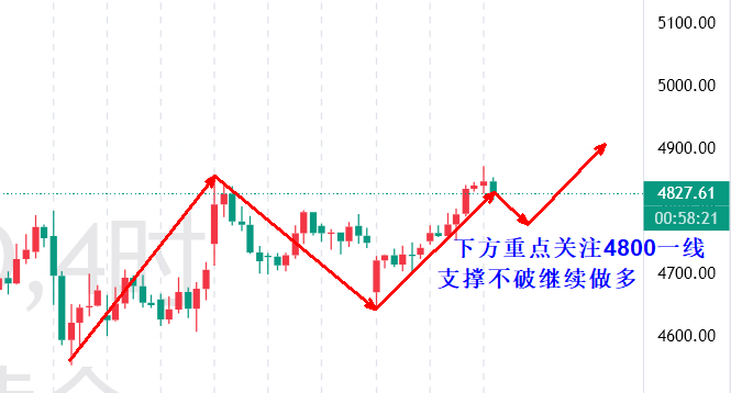 若午后回落力度充足,可考虑在4800-4805区域布局多单;若回调有限,则可在4815-4825区间提前进场。上行目标先看4847,其次看4870附近。近期操作应以跟随上行趋势为主,谨慎逆势做空。如考虑空单,仅建议在关键阻力4900附近轻仓尝试,且需快进快出。