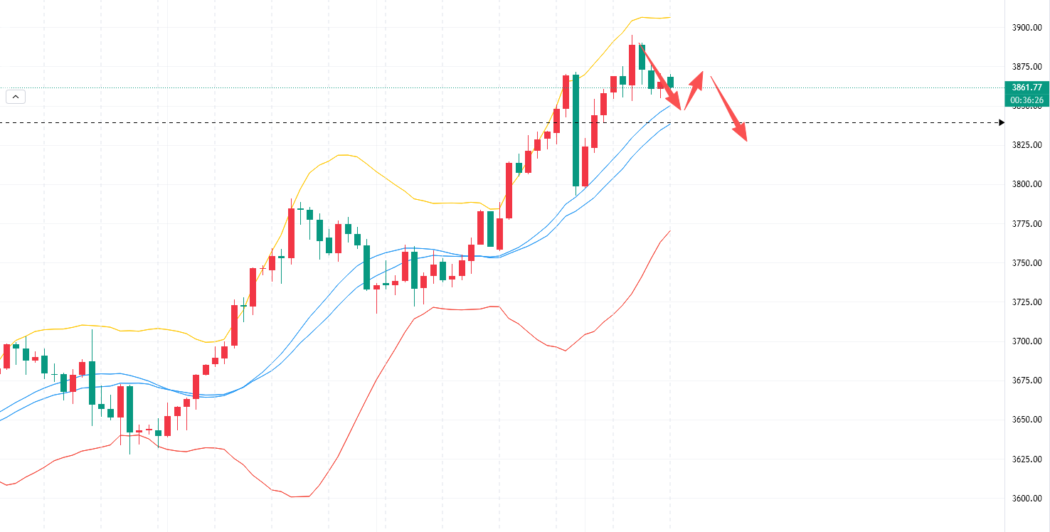昨天黄金高位震荡,刷新高3895后,开始震荡向下,日线收带有长上影线的十字阳。高处不胜寒,李槿昨日也强调了看多的朋友,接近高点看多不追多。昨日早盘也给到了3900空的思路,虽然没给到机会,但是可以看到,整数关口的*不会小。结合昨天的收线,黄金受阻信号明显,还有继续下跌的空间和需求,所以今日主空辅多的思路即可。当然如果行情冲高直接来到3900上方,冲高回落也有可能的。