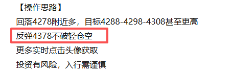 美盘前实战4286多,反弹给到4310直接落袋为安了,不恋多。早盘公开的思路4379空,行情两次兑现。欧盘最低回落4315附近,不知大家有没有关注到李槿的思路。实战这边早盘开盘4379直接空,止盈在4310,止盈还是设保守了,最低回落给到了4278附近。随后4302反手多,也是收获不错。上方阻力依旧关注4380附近,强势走高看向4400。下方支撑4300和4280附近。周五建议稳健一点,我们实战已经三连胜落袋,日内收获利润很可观了,晚上选择多观望了。今日利润还没有吃够的朋友,可以看一下上面说的支撑阻力高空低多。