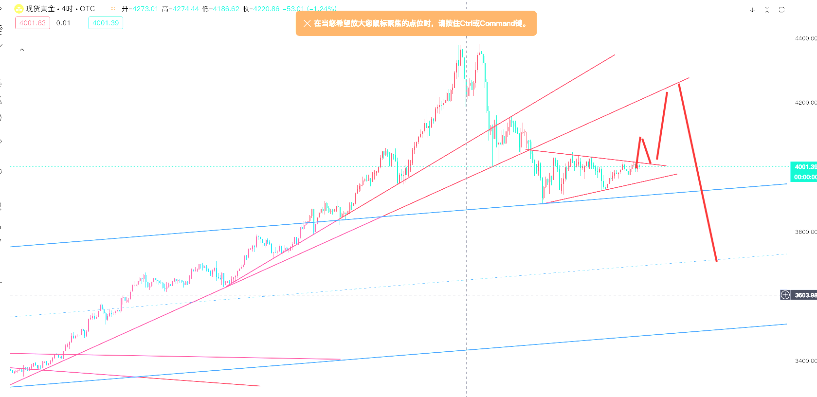 目前行情以回落做多为主,而上方需要关注的点就是4082一线,下方关注4012一线。这就是今日的区间4010-4082一线。并且4小时以回落做多为主。那么11点收线还没有拔高我们就可以提前空也就是刚刚给的4052-54附近的空。