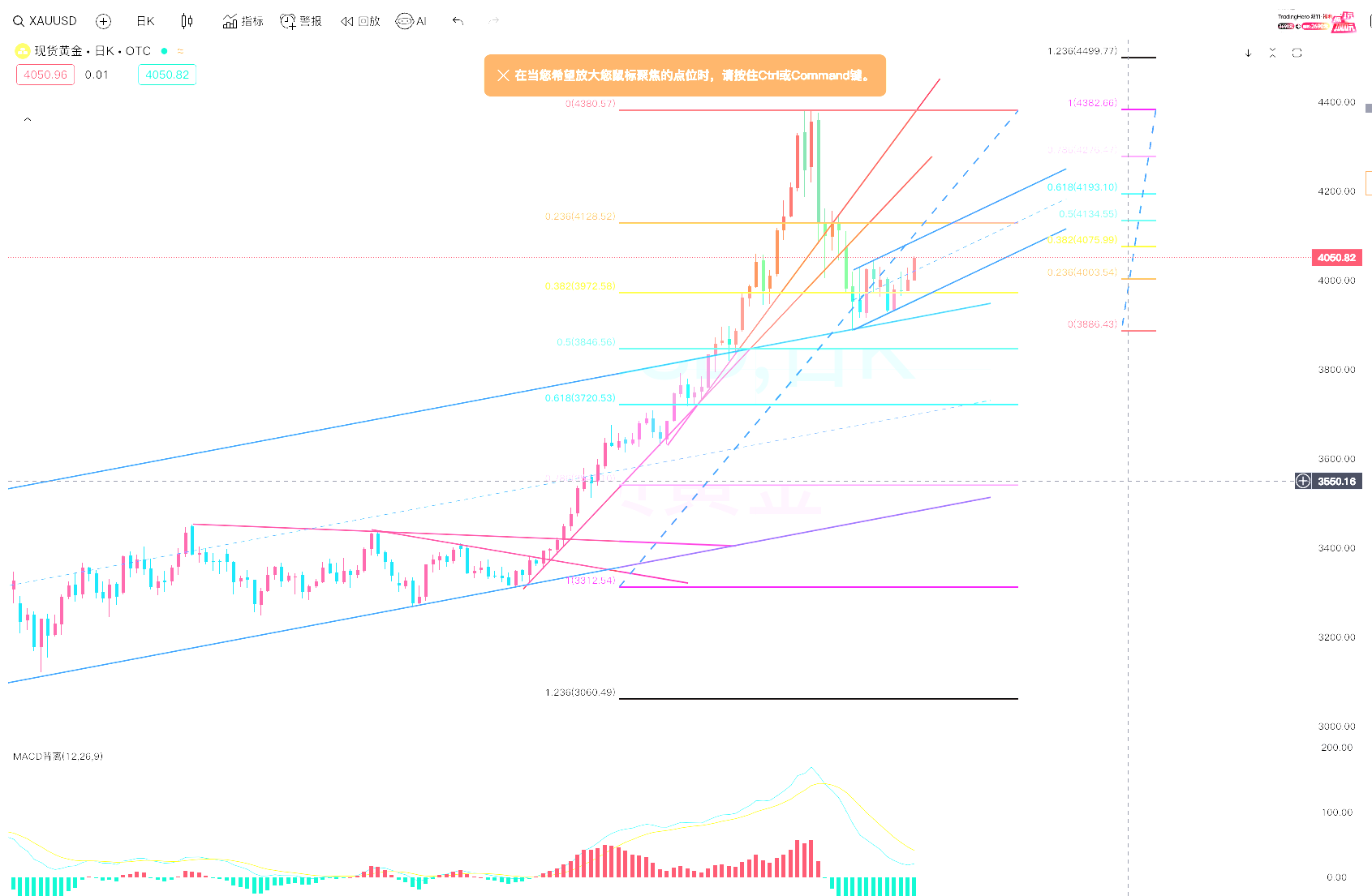周线目前关注4082附近的压力已经破,突破后会继续上涨。而下方关注支撑3940和3886一线,短期认为价格维持在4106区域会有所调整