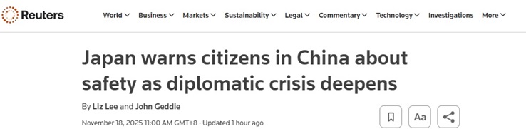 FX168财经报社(亚太)讯 英国路透社周二(11月18日)最新报道称,日本因与中国在台湾问题上的争端加剧,警告在华公民加强安全防范并避免前往人群密集场所。