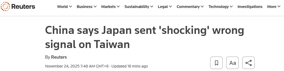 王毅指责日本首相高市早苗(Sanae Takaichi)试图在台湾问题上进行军事干预。王毅所指的是高市早苗在11月7日于国会回答质询时的言论:她称,假设北京对台湾发动攻击,可能会触发东京的军事回应。
