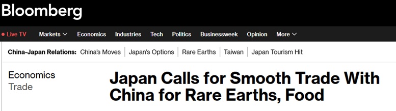 FX168财经报社(亚太)讯 美国彭博社周五(1月9日)最新报道称,在有报道称北京正阻碍食品和稀土等商品贸易、且亚洲两大经济体之间的争端不断升级之际,日本呼吁确保食品和稀土的顺畅运输。