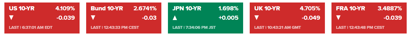 债市方面,美国国债收益率走低。随着美国政府仍处于停摆状态,10年期美债收益率从周四的4.14%降至4.12%。市场预计,美联储将于10月29日再次降息25个基点,CME FedWatch工具显示降息概率为94.6%。