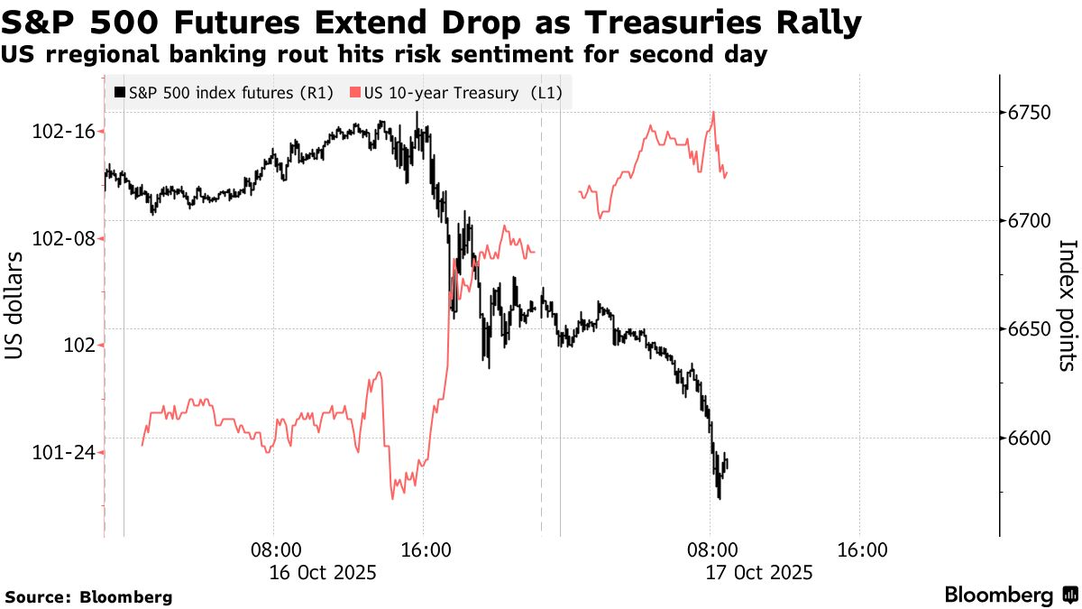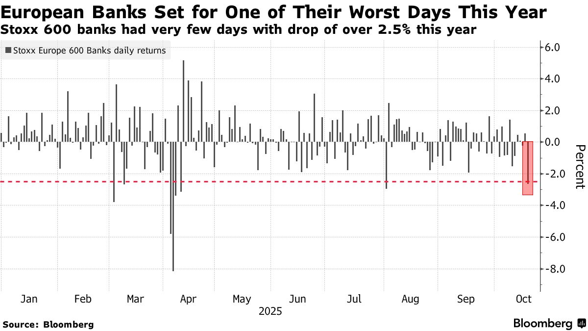 这一系列走势凸显了市场对美国信贷市场的担忧,清楚地表明华尔街正弥漫着紧张的情绪。这些担忧叠加已有的一系列焦虑,包括美国政府关门、AI泡沫风险以及中美贸易紧张局势再度升温。