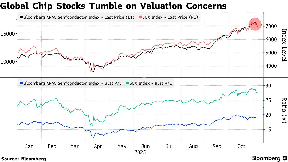 本轮抛售导致费城半导体指数和彭博亚洲芯片股指数的市值分别在周二和周三蒸发约5000亿美元。