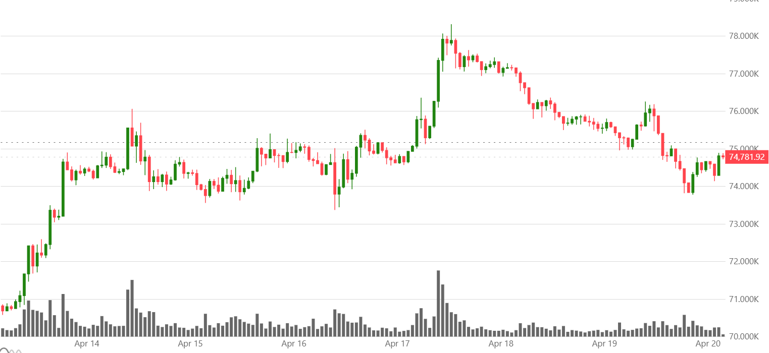 FX168财经报社(亚太)讯 在刚刚过去的周末,美国海军扣押一艘伊朗船只,伊朗方面则重新对霍尔木兹海峡实施管控,中东地缘风险再度升温。周一(4月20日)市场情绪再度恢复谨慎,比特币过去两日自高位击落回落,目前交投在7.4万美元附近。