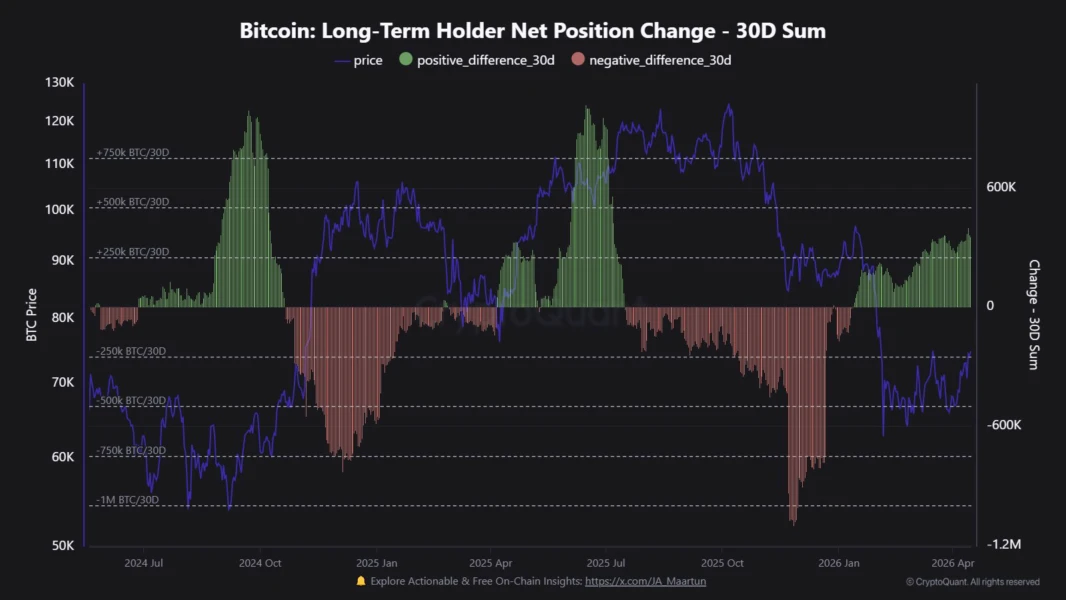 链上数据显示,这一筑底过程是伴随着长期持有者(LTH)供应量回升而展开的。所谓长期持有者,通常是指持币时间已超过155天的投资者。这一变化至少说明,随着比特币进入盘整阶段,市场中的长期持币信念正在增强。过去一个月中,约有34.5万枚比特币“成熟”为长期持有者持仓
