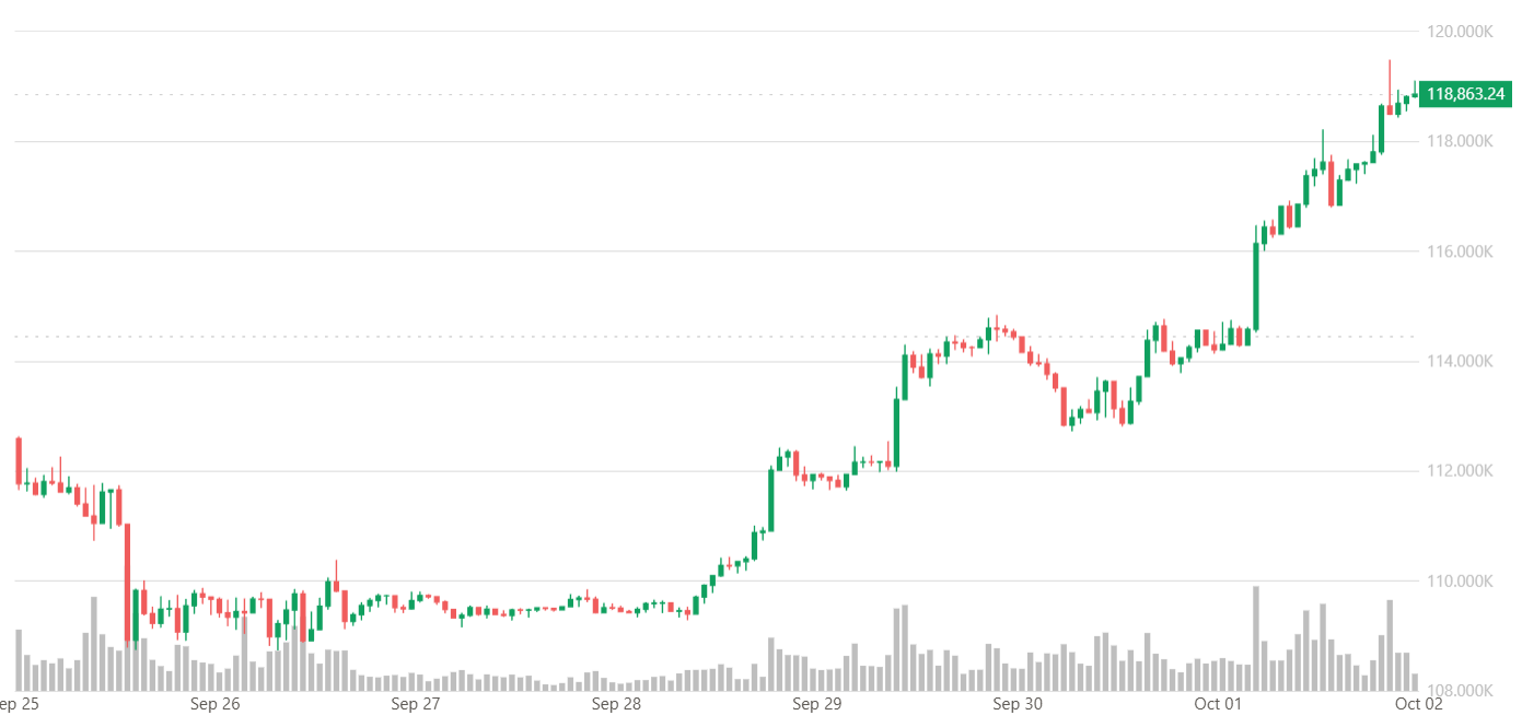 FX168财经报社(亚太)讯 周四(10月2日)进入亚市盘中,比特币继续在两个月多来的最高水平附近徘徊,目前交投在11.9万美元上下,美国政府停摆可能会推迟重要经济报告的发布,为法币流动性的积极推动创造条件。