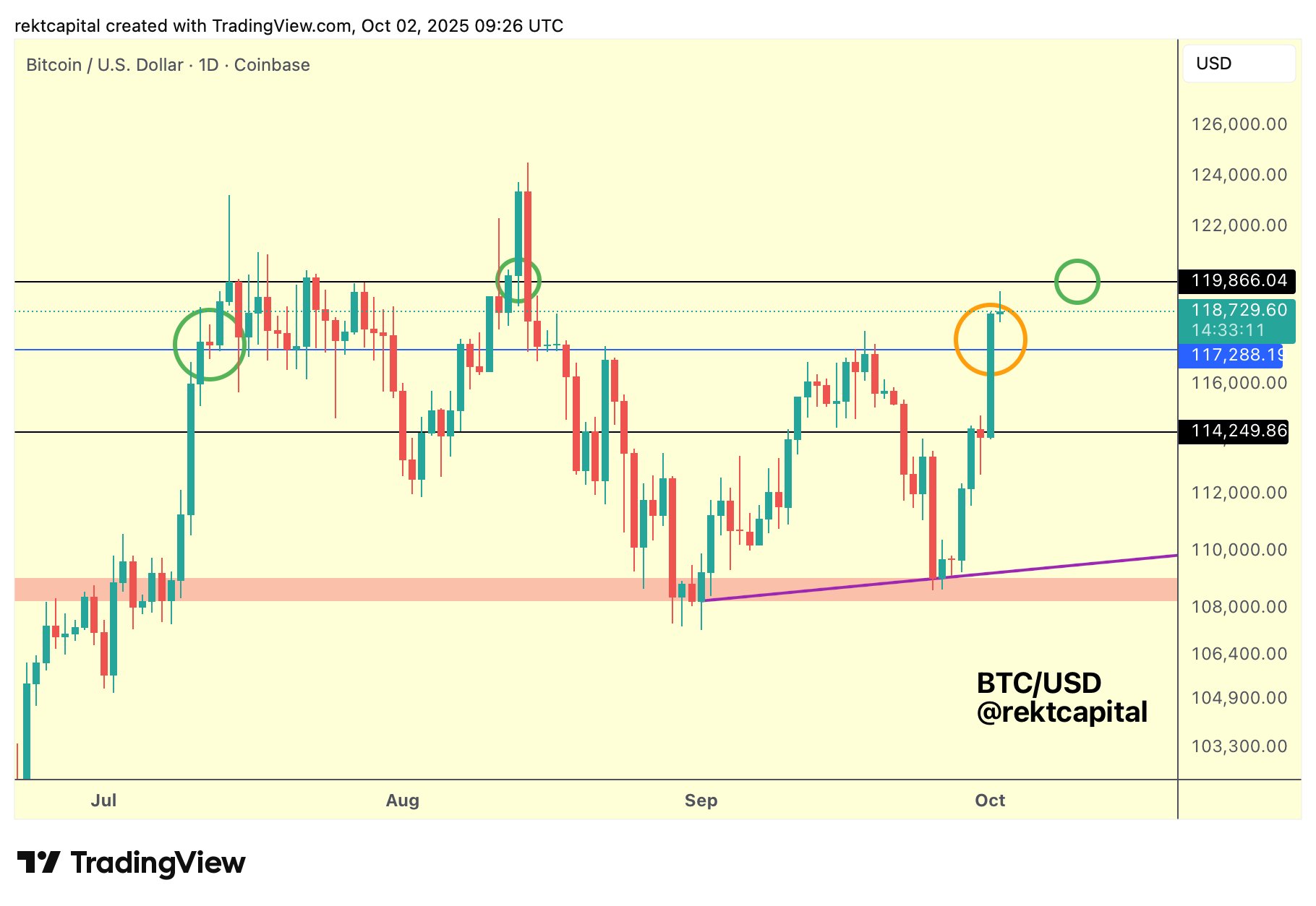 (比特币日线图 来源:Rekt Capital/X)