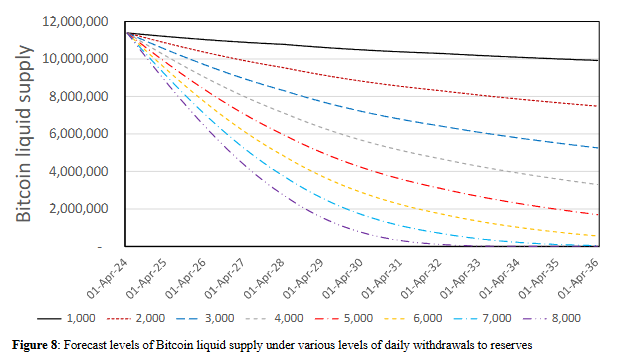 研究显示,如果每日退出流通维持在6000枚,流动供应会在2029年底前降至200万枚以下;如果退出流通速度加快到7000枚,这个时间点会提前到2028-2029年。