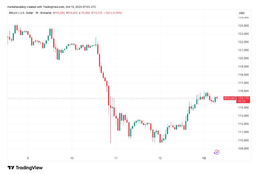 比特币自史上最大清算潮中强势反弹,目前最高触及11.6万美元。