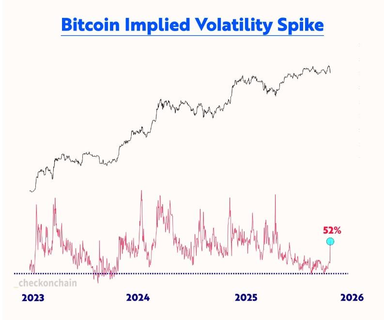过去几天的事件令比特币价格波动率尤为突出。据加密量化分析师Frank A. Fetter指出,隐含波动率已升至自四月以来的最高水平——正值关税危机高点。