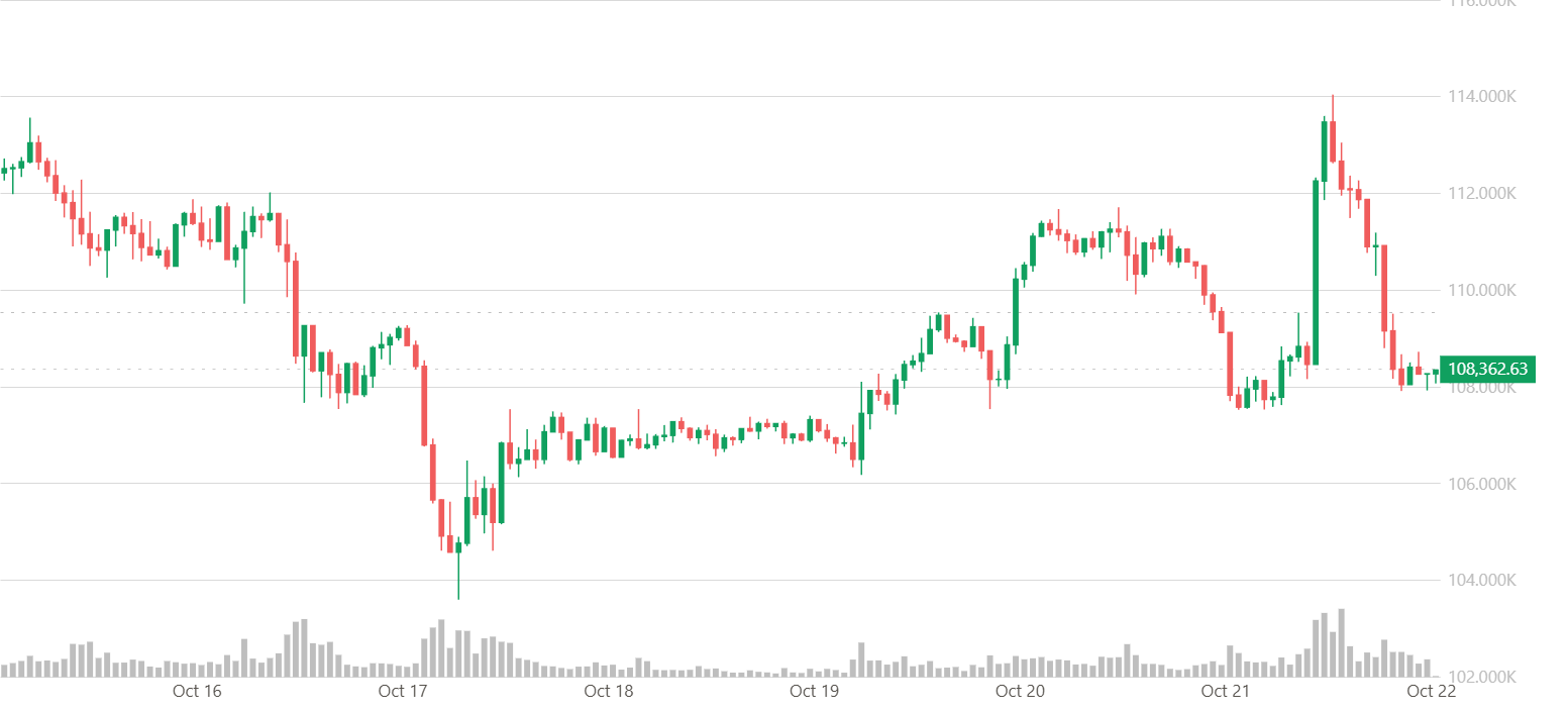 摘要:周三(10月22日)进入亚洲交易时段,比特币反弹乏力,徘徊在10.8万美元上方,宏观不确定性上升及 ETF 资金流降温压制了数字资产情绪。与此同时,黄金则在创纪录暴涨后出现剧烈回调。