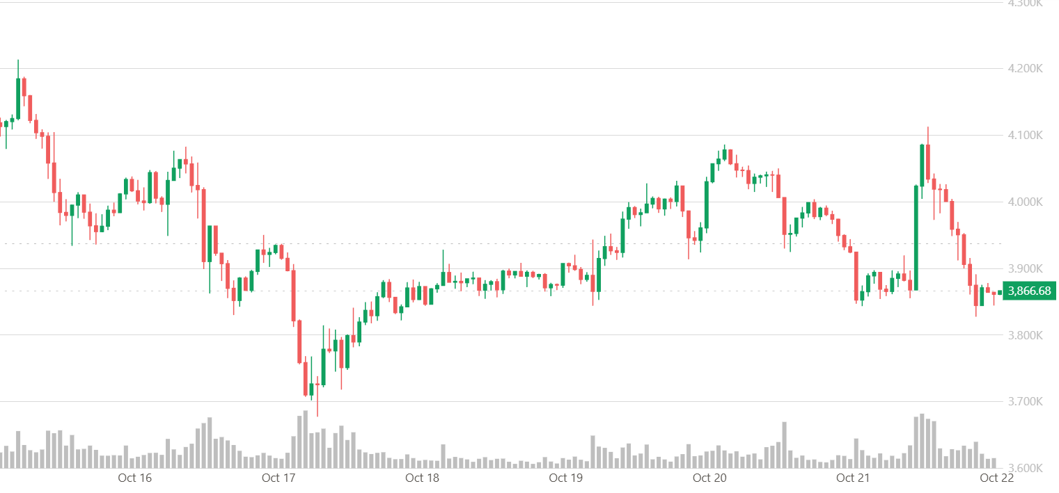与此同时,以太坊延续昨日冲高回落势头,目前交投在3850美元附近。