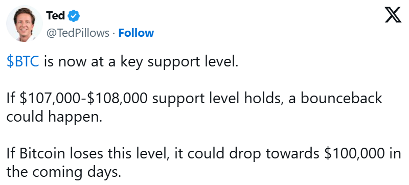 加密货币投资者兼企业家Ted Pillows认为,如果BTC价格无法建立稳固底部,10万美元将成为下一个重要关注点。