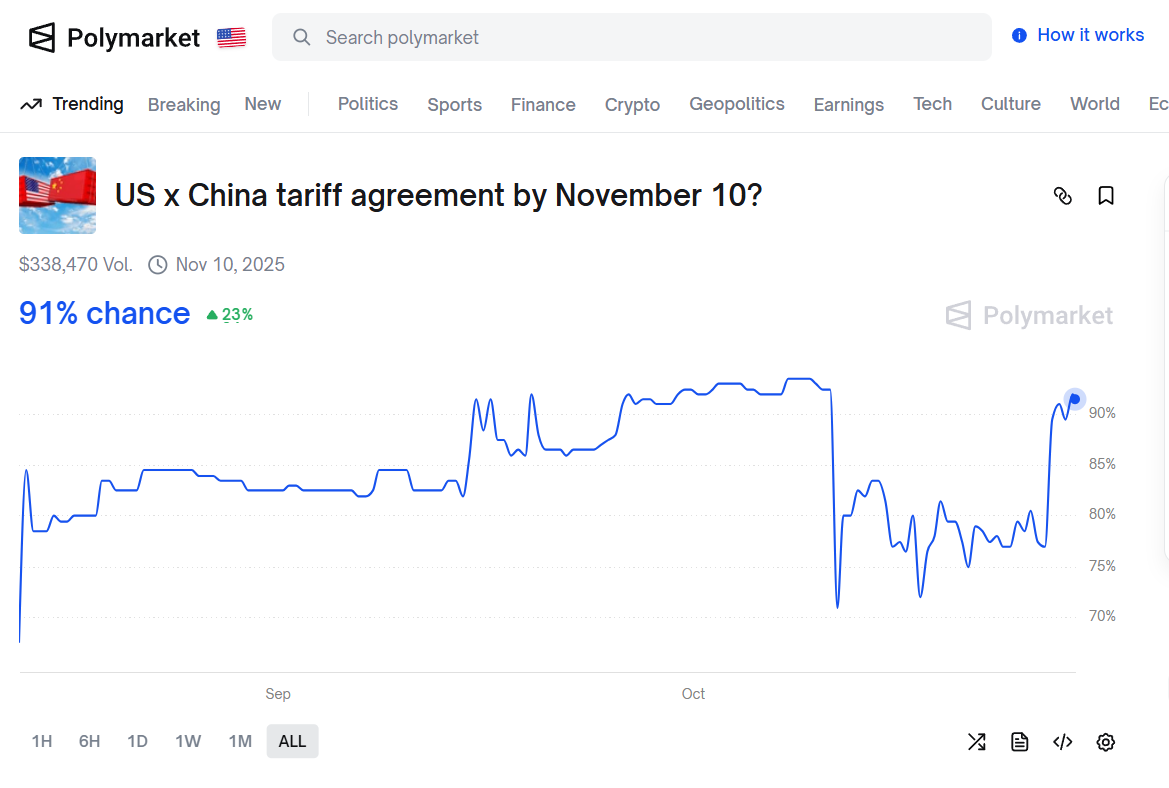 根据去中心化预测平台 Polymarket 的数据显示,交易者正大举押注中美贸易突破,预计在马来西亚进行的建设性会谈之后,中美双方在11月10日前签署关税协议的概率高达92%。