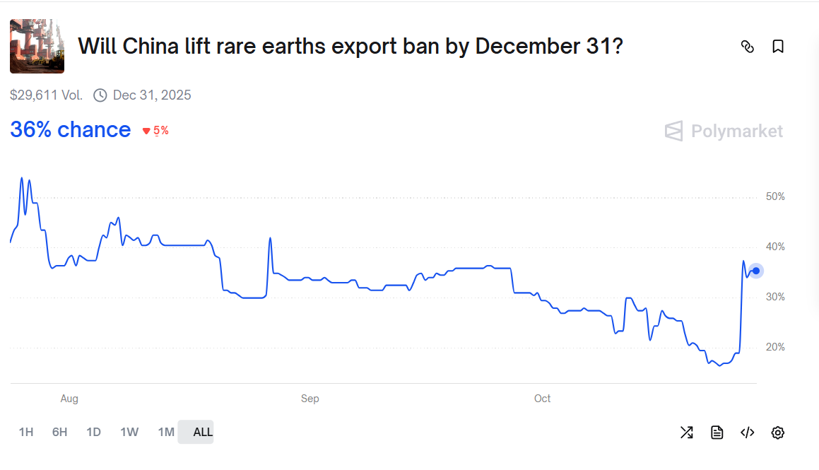 不过,并非所有信号都表明贸易关系将出现持久缓和。另一份 Polymarket 合约显示,投资者认为北京在年底前解除稀土出口禁令的概率仅为36%,这表明市场预计双方将在关税上展开战术性合作,但在战略资源领域的竞争仍将持续。