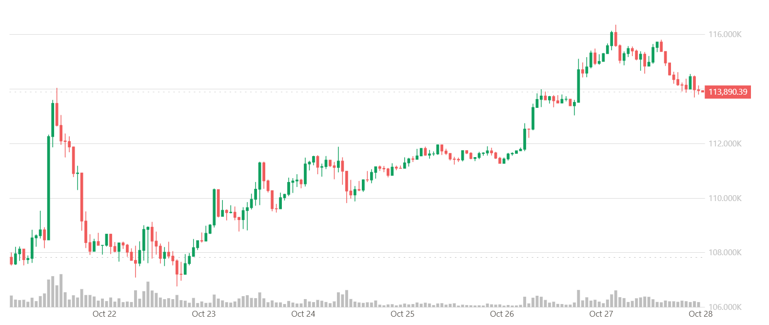 比特币昨日一度升至116,200美元,随后回落至114,000美元附近整理。交易者正等待特朗普—习近平会晤及美联储的政策指引。根据 CoinDesk 的数据,比特币在本月初自126,000美元暴跌至接近105,000美元后,已反弹至114,000美元附近。