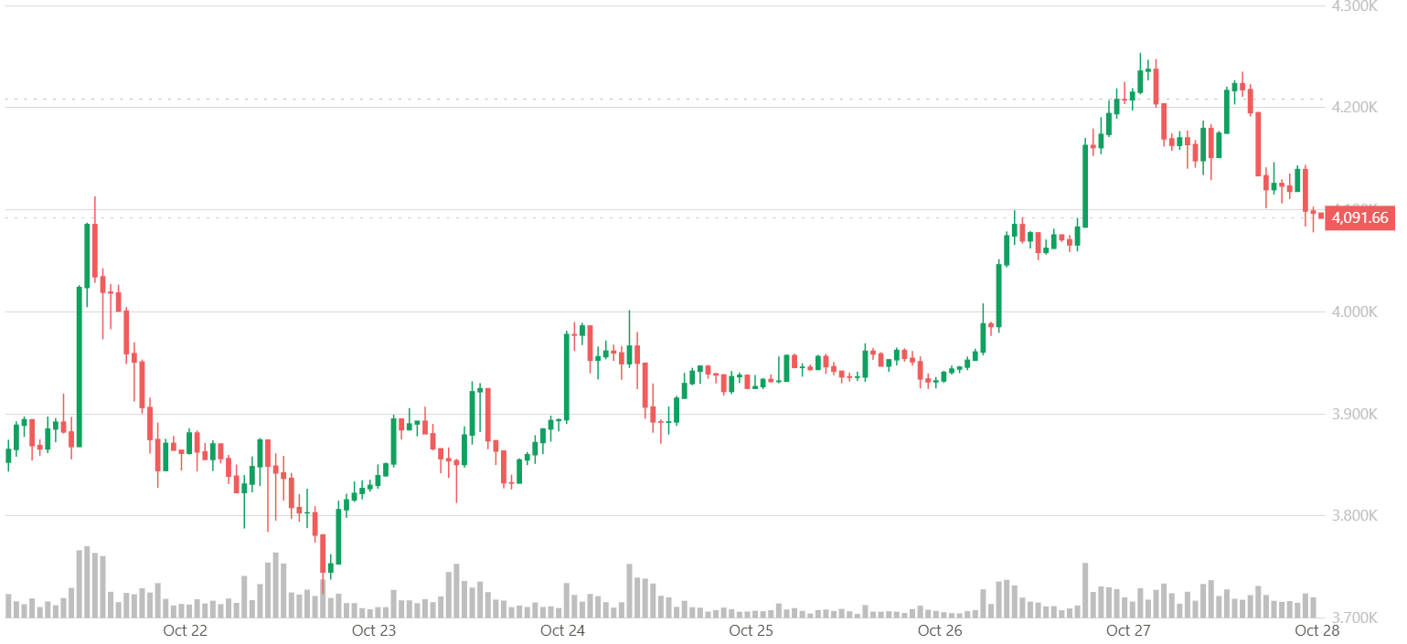 FX168财经报社(亚太)讯 周二(10月28日)亚洲交易时段,比特币在连续几日强势拉涨后,昨日冲击11.6万关口失败,目前在在11.4万附近稍作喘息,与此同时,以太坊在4100美元附近等待进一步线索。市场正进入今年最关键的一周之一,焦点集中在中美外交、美联储政策转向,以及科技巨头密集发布财报。