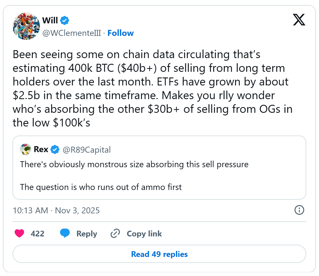 过去一个月,长期持有者已出售近40万枚比特币,总价值超过400亿美元。然而,比特币现货ETF同期净流入仅约25亿美元,意味着仍有超过300亿美元的抛售资金去向不明,引发市场对“接盘方”的广泛讨论。