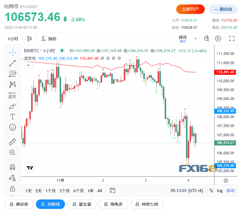(比特币1小时走势图,来源:FX168)