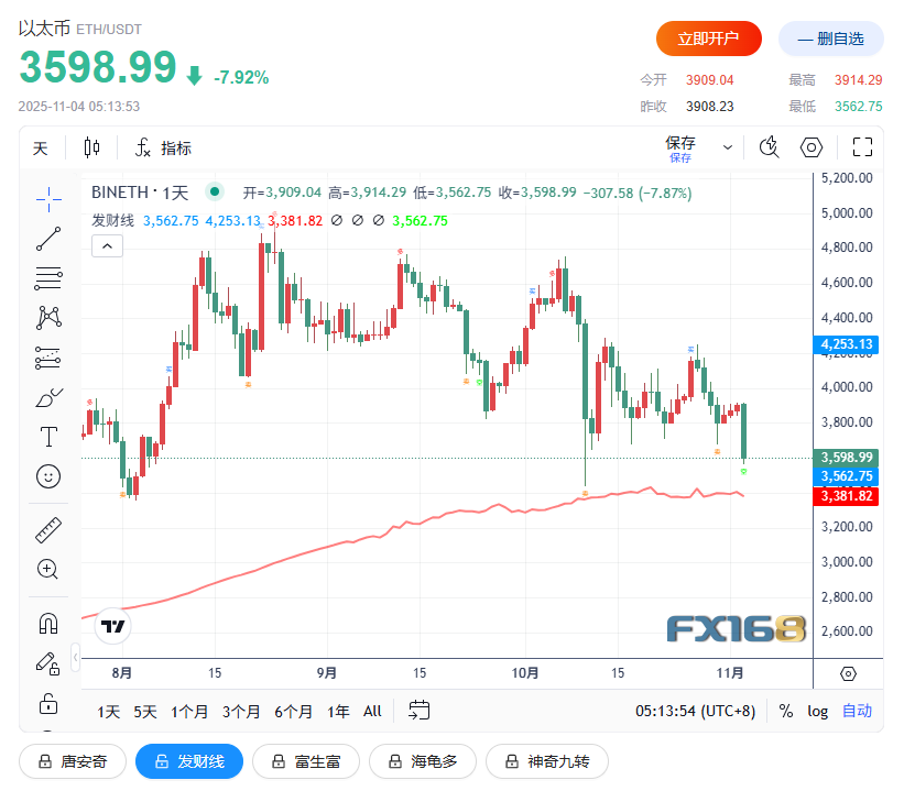 以太坊(ETH)跌幅明显高于比特币。周一盘中一度暴跌9%,跌破关键支撑位3600美元,日内跌幅收窄至约6.7%,现报3,598.99美元,较8月22日高点4885美元已回落近25%。