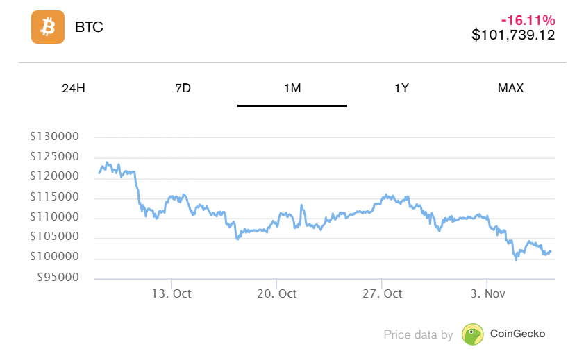 比特币隔夜一度跌至 100,420美元,随后在亚洲时段略有反弹至 约101,000美元。过去一周累计下跌近 7%,较10月创下的历史新高 126,080美元 下跌超过 19%。市场分析人士认为,这反映出宏观经济动荡、流动性担忧以及投资者风险偏好下降等多重因素的影响。#比特日报#