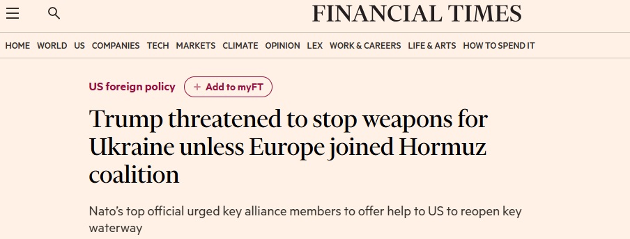 #伊朗危机追踪#FX168财经报社(亚太)讯 英国《金融时报》周四(4月2日)发布独家报道称,据知情人士透露,美国总统特朗普(Donald Trump)曾威胁要停止向乌克兰提供武器,以施压欧洲盟友加入旨在重新开放霍尔木兹海峡的“自愿联盟”。