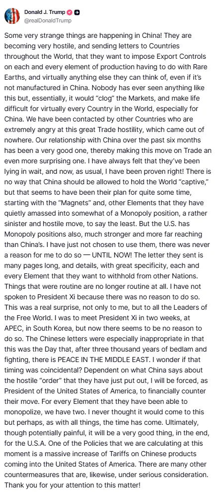 FX168财经报社(北美)讯 美国总统唐纳德·特朗普(Donald Trump)周五(10月10日)在社交平台 Truth Social 上发表强硬言论,威胁将对中国商品实施“大规模加征关税”,以“在经济上反制”中国最新的稀土出口限制措施。特朗普指责中国“变得非常敌对”,并称其正通过控制关键稀土资源“挟持整个世界”。此番表态令全球市场情绪急剧恶化,美股主要指数快速下跌,而稀土相关股票则逆势大涨。