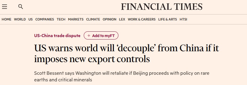 #中美关系#FX168财经报社(亚太)讯 英国《金融时报》周三(10月15日)报道称,美国财政部长贝森特(Scott Bessent)警告北京称,中国对稀土和关键矿物实施的新一轮广泛出口管制,将迫使美国和其他国家与中国脱钩。