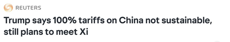 #中美关系#FX168财经报社(亚太)讯 英国路透社报道称,美国总统特朗普(Donald Trump)当地时间周五(10月17日)表示,他提出的对中国商品加征100%关税的提议是不可持续的,但他将贸易谈判的最新僵局归咎于北京方面,称中国当局加强稀土出口管制是导火线。