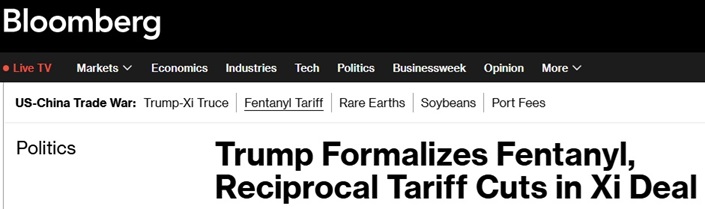 彭博社指出,下调的关税水平标志着美国对中国作出的重大让步。这些调整是特朗普与习近平达成的更广泛协议的一部分,旨在在双方数月的关税上调与出口限制之后,缓解贸易摩擦、放宽贸易壁垒。