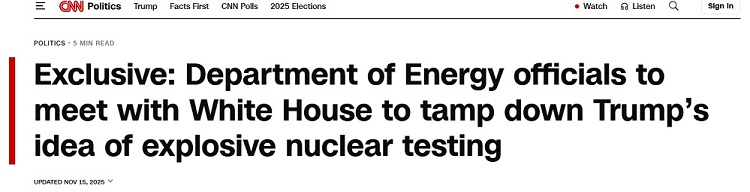 根据CNN报道,两名知情人士透露,能源部长克里斯・赖特(Chris Wright)、国家核安全管理局局长布兰登・M・威廉姆斯(Brandon M. Williams)以及美国国家实验室的官员,计划告知白宫,他们认为特朗普上月提议的为核弹头试验而引爆武器的做法并不可行。