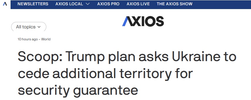 #俄乌战争#FX168财经报社(亚太)讯 美国新闻网站Axios周三(11月19日)发布独家报道称,据一名直接了解情况的美国官员向Axios透露,美国总统特朗普(Donald Trump)新的结束乌克兰战争计划将把乌克兰东部部分目前并不在俄罗斯控制之下的地区划给俄罗斯,作为交换,美国将向乌克兰和欧洲提供安全保障,以防止未来的俄罗斯侵略。
