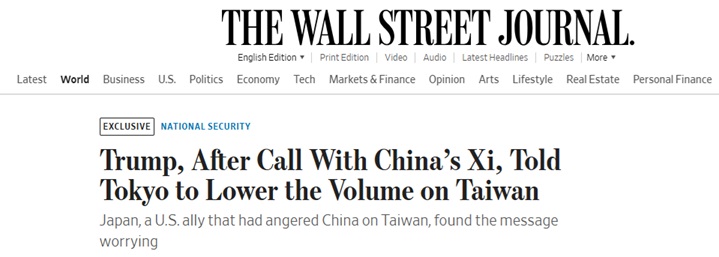 #中美关系#FX168财经报社(亚太)讯 美国《华尔街日报》周四(11月27日)独家报道称,美国总统特朗普(Donald Trump)在与中国国家主席习近平通话后,告诉日本在台湾问题上“调低音量”,可能反映出他愿意为中美贸易关系而约束一个盟友在核心地缘政治问题上的争议性立场。报道称,特朗普传达的信息令日本方面感到担忧。