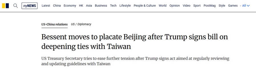 FX168财经报社(亚太)讯 美国财政部长贝森特(Scott Bessent)在美国总统特朗普(Donald Trump)签署一项旨在定期审查并更新对台交往指引的法案后,称北京为“盟友”,试图缓和进一步的紧张局势。