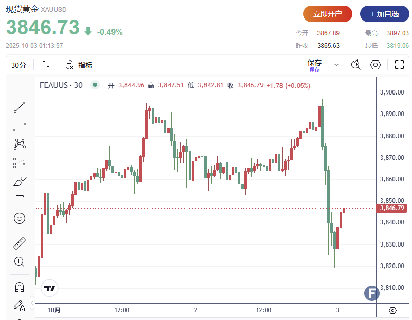 截至发稿,现货黄金下跌约0.49%,至每盎司3,846.73美元。