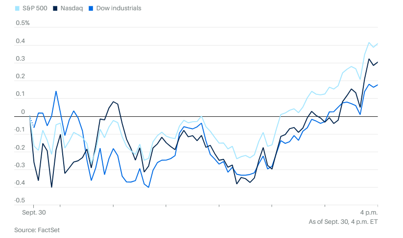 美股周五尾盘大幅反弹,为十多年来表现最好的九月画上句号。道琼斯工业平均指数上涨82点,涨幅0.2%,创下收盘新高。标普500指数上涨0.4%,纳斯达克综合指数上涨0.3%。标普和纳指都是自2010年以来表现最强劲的九月,标普指数也实现了连续第五个月上涨。