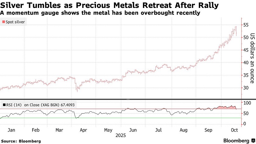 彭博社称,衡量价格动量的指标,即相对强弱指标(RSI)显示,白银9月底以来买盘过热,预示价格可能出现回调。黄金也面临类似的情况。